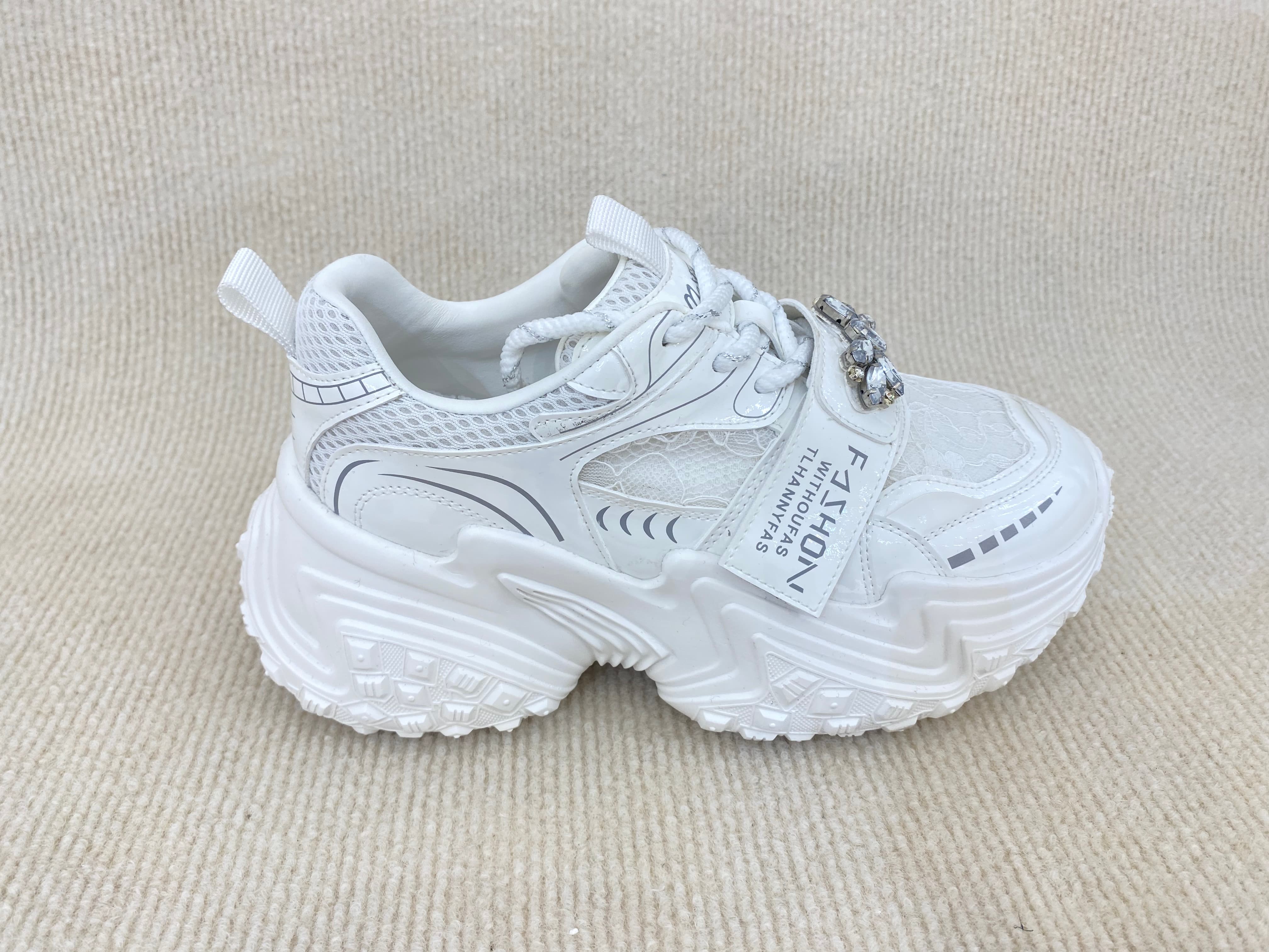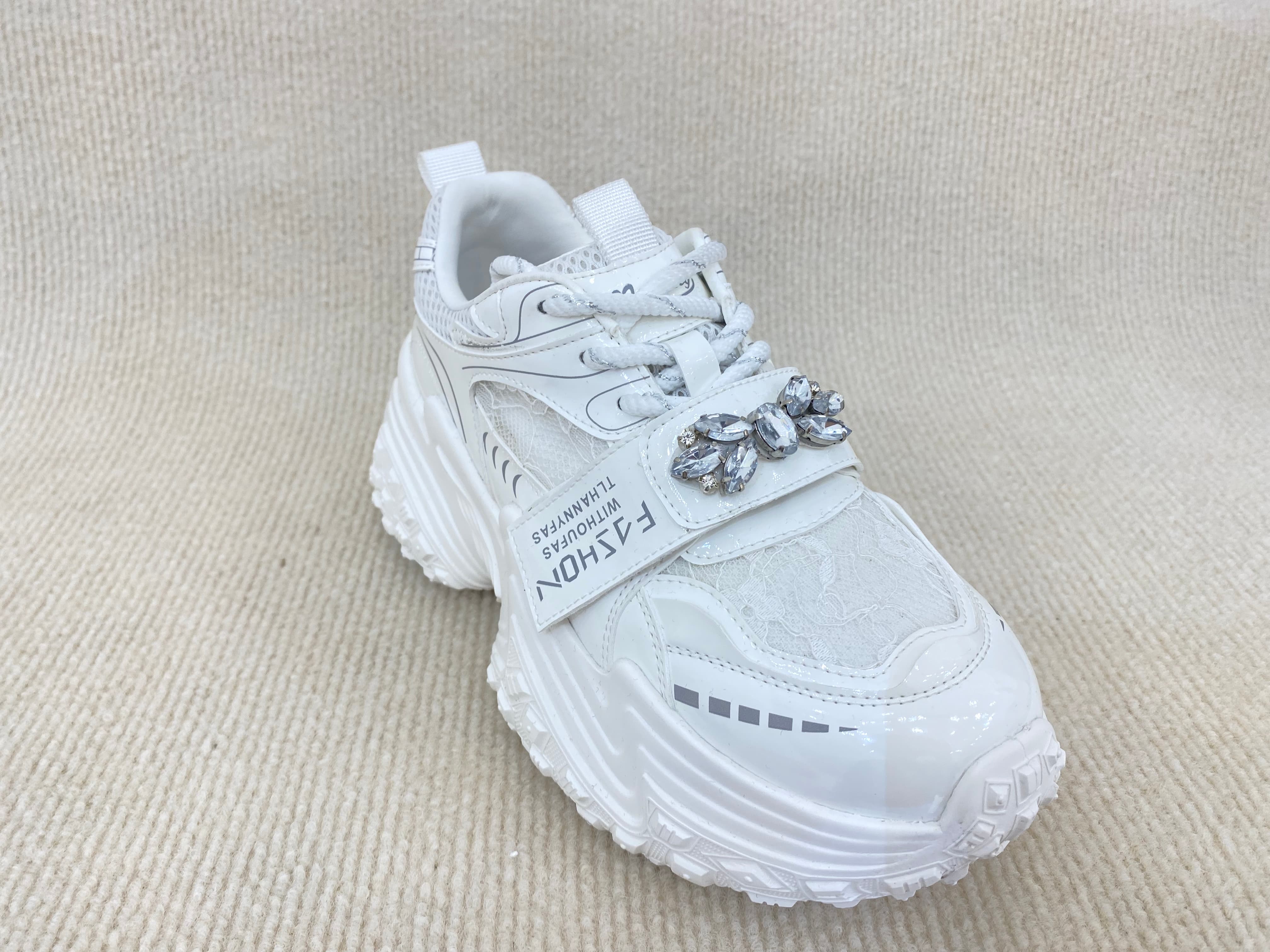 Women white flat fashion sneakers with paillette crystal breathable mesh and low cut Images |